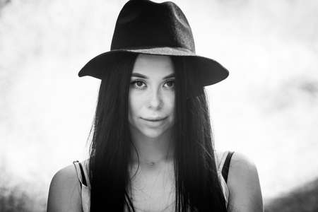 Portrait of a young girl in a black hat for a walk.
