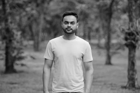 Young handsome bearded Indian man at the park in black and white