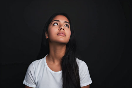 A young woman with long curly hair and a white t-shirt sits casually, gazing upward with a contemplative expression. The dark background contrasts with her contemplative state, accentuating her thoughtful presence.