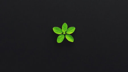 A close-up shot of a green plant with five leaves arranged in a star shape against a black background. The image is minimalist and focuses on the plants natural beauty.