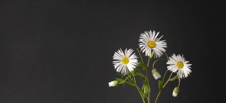 white daisies on a black background. beautiful bouquet of flowers in a vase. vertical simple, stylish and bold still life