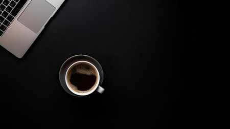 Overhead shot of dark modern workspace with laptop, stationery, coffee cup and copy space on black table