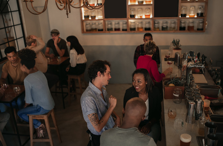 Cheerful young people enjoying drinks and lively conversation at a stylish bar counter, creating a vibrant atmosphere of friendship and fun