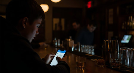A young man is seated at a bar counter, deeply focused on his smartphone. The scene is dimly lit, with the warm glow of the bar and ambient lighting creating a moody atmosphere. The man's face is illuminated by the phone's screen, which text. In the background, blurred figures and bar including glasses and bottles, suggest a typical bar environment. The focus is on the individual's interaction with technology in a social setting.