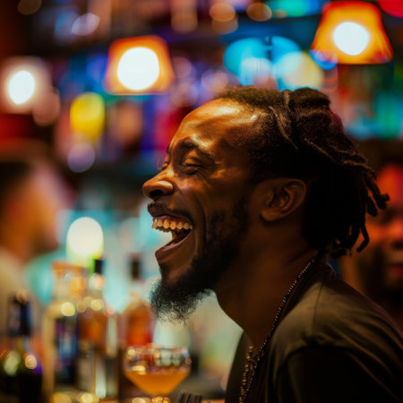 Casual night out at a bar with a relaxed man leaning on the counter, talking