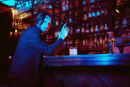 A wounded special agent drinks whiskey in a bar after completing a dangerous mission. Action movie hero.