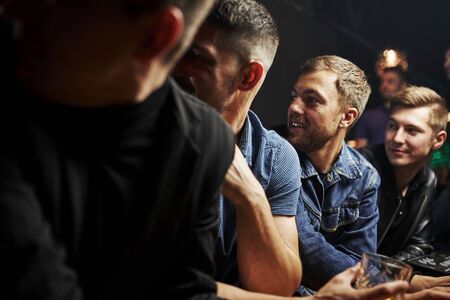 Side view. Friends resting in the pub with alcohol in hands. Having conversation.
