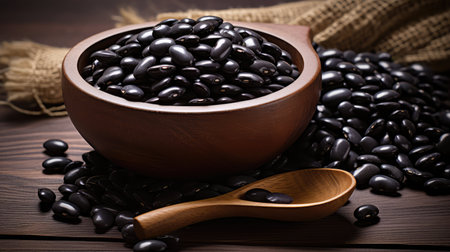 Generative AI : Black beans in wooden bowl Top view Copy space