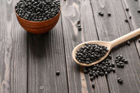 Black soy beans ( Urad dal, black gram, vigna mungo ) in wooden scoop isolated on wood table background.