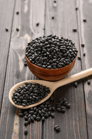 Black soy bean seeds in a wooden bowl with spoon on white background