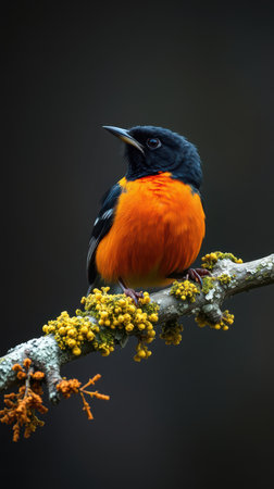 A vibrant orange-breasted bird perches on a lichen-covered branch during the day