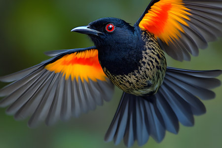 Stunning close-up of a vibrant bird in mid-flight, its striking red eyes and distinctive orange wing markings. perfect for nature-themed designs and wildlife photography enthusiasts. Generative AI