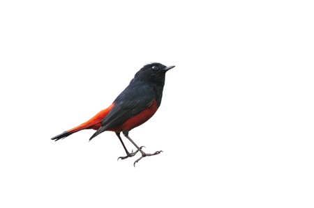 A brightly - colored redstart with black color , wine - red belly and tail and a white cap.