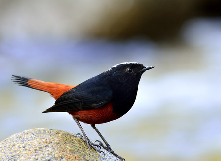 White-capped Water Redstart, a beautiful black and orange bird standing on rock in the stream side profile