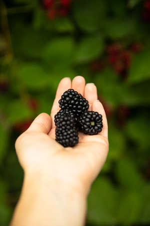 Hand holding fresh blackberries, selection on blurred background with copy space