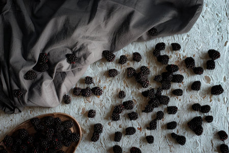 A beautiful array of fresh blackberries positioned on a light grey surface, perfect for showcasing their luscious texture and appealing color in food photography.