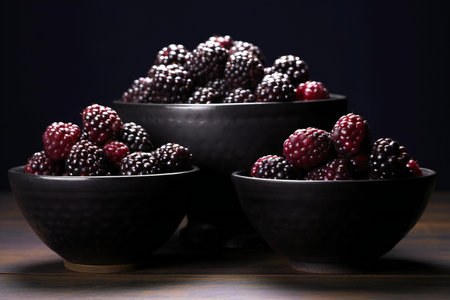 A striking close-up of fresh blackberries piled in a rustic bowl against a dark background, showcasing their rich color and inviting texture. Perfect for food enthusiasts and health-conscious individuals.