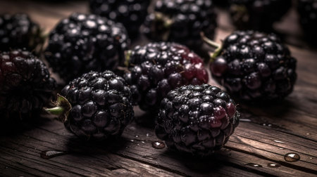 Ripe and sweet blackberries on brown wooden table