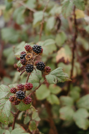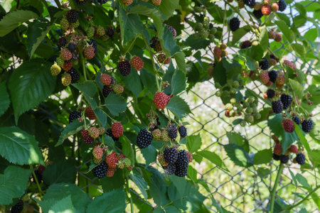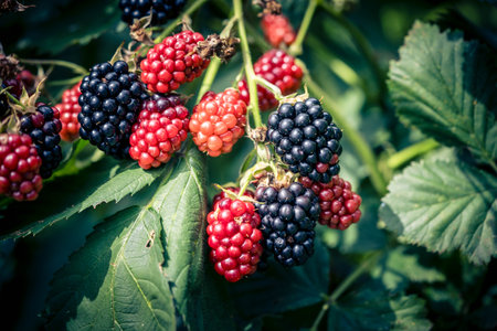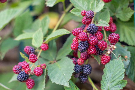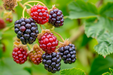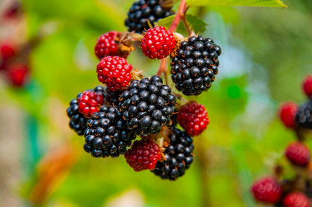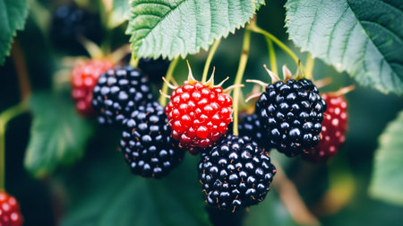 Close-up of ripe and unripe blackberries growing on a blackberry bush, showing a vibrant transition from red to deep black as they reach full ripeness, concept of a bountiful harvest