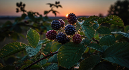 This image showcases a close-up of blackberries growing on a bush with green leaves. The composition is set against a blurred background with a vibrant sunset. The lighting creates a natural, warm atmosphere, suitable for various uses including editorial and commercial projects that require imagery of nature.