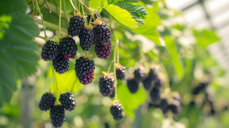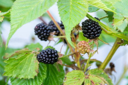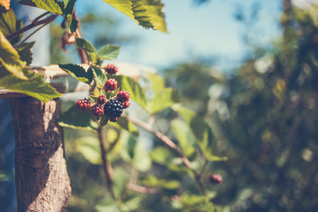 Blackberries ripening on the vine in a sunlit garden during late spring