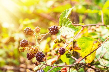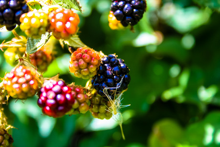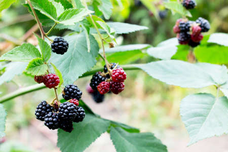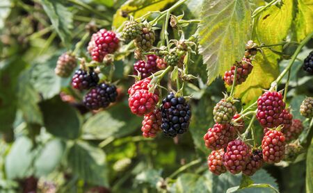 Red and black wild blackberries bushes and branches on green leaves background in Italian garden during a sunny summer day