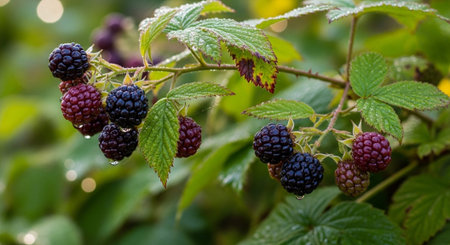 Juicy blackberries grow on their vines among vibrant green leaves, glistening with morning dew in a garden.