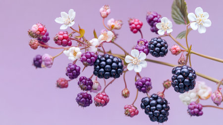 Overhead view reveals a blackberry plant featuring sharp thorns, clusters of purple berries, and small white flowers set elegantly against a soft lilac backdrop.