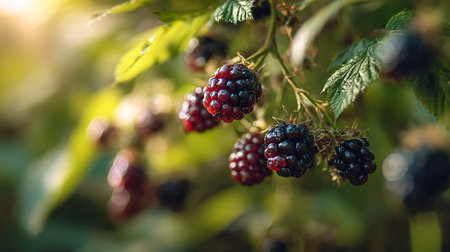 A captivating scene featuring fresh ripe blackberries elegantly hanging from a branch, against a soft focus forest backdrop illuminated by gentle light, evoking a sense of tranquility and natural beauty.