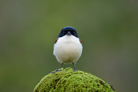 Burmese Shrike (Lanius collurioides) Funny white chest bird making puffy feathers while perching on mossy spot in early morning lighting