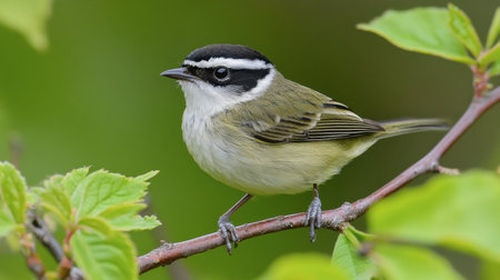 the blackcap, a striking european sylvia chat-rouvrou, perches delicately on a sturdy brown stem, showcasing its striking black cap and white cheek patch, against a vibrant bright green background, highlighting its natural habitat and showcasing its unique bird features in high-contrast hd photography. ai generated