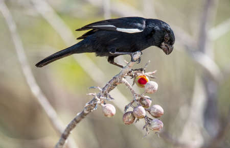 Cuban Bullfinch ( Melopyrrha nigra ) feeding. Cuban Bullfinch (Melopyrrha nigra) perched on a branch in Cuba.