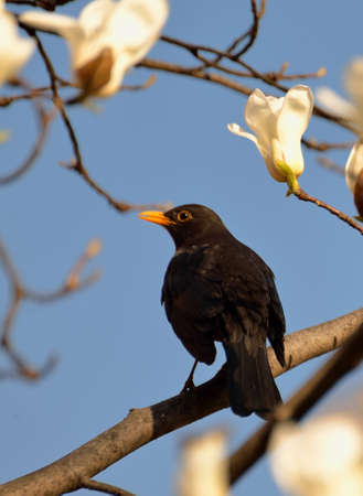 Male Blackbird in garden in spring.