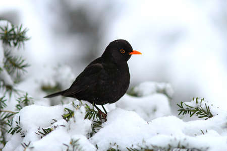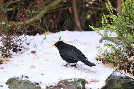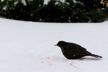 Male Blackbird feeding in the snow.