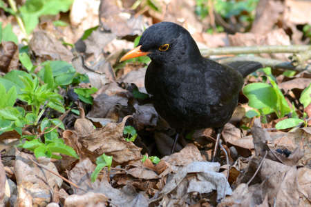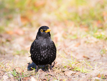 Male Eurasian common blackbird sitting on the ground