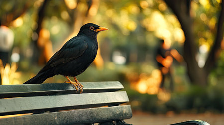 A striking image of a black bird with a yellow beak perched on a park bench, surrounded by lush greenery and blurred people in the background.