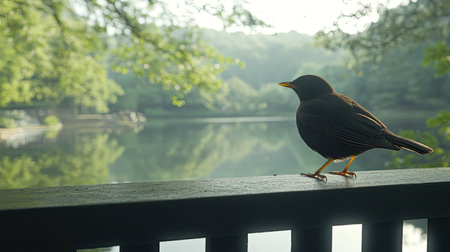 A solitary bird perches on a wooden railing, overlooking a calm lake. The soft morning light reflects on the water, surrounded by lush greenery.