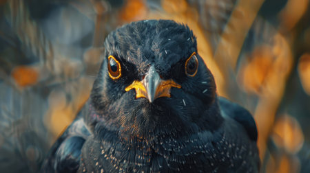a black bird with yellow eyes captured in a contemporary portrait photography style. the image showcases a dark sky-blue and orange backdrop, highlighting the bird's sharp and clever humor. the photograph also incorporates elements of hyperrealistic marine life, drawing inspiration from the dusseldorf school of photography. with minimal retouching and the technique of focus stacking, this image captures the bird's intricate details with stunning clarity.