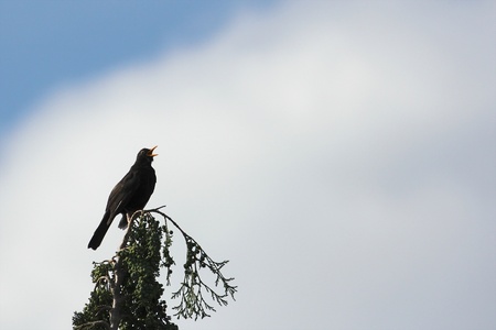 Blackbird sitting on top of a fir tree singing its lungs out with room for your text