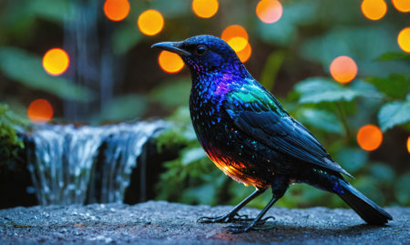 A vibrant bluebird perches on a rock near a small waterfall, illuminated by warm, orange lights in the background