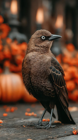 A brown bird stands gracefully among vibrant orange pumpkins creating a perfect Halloween scene filled with autumnal charm and festive vibes.