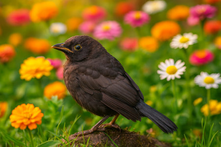 AI-Generated image of a blackbird perched on a rock in a vibrant garden. The bird’s dark plumage contrasts beautifully with the bright, colorful flowers surrounding it.