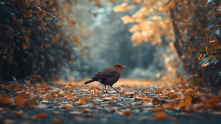A bird explores a leaf-covered path