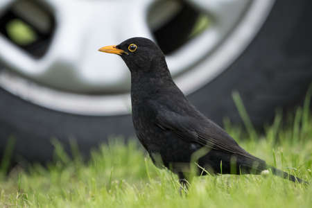 Blackbird on the grass in europe. Wild animal