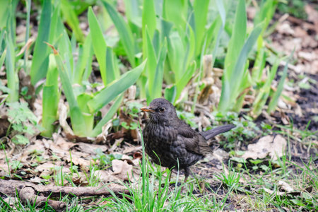 Female blackbird,tuldus merula, on the ground in the garden