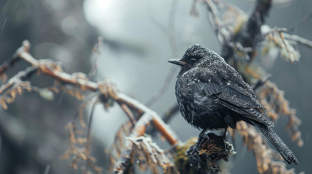 Blackbird sitting on a tree branch in a dark winter forest.