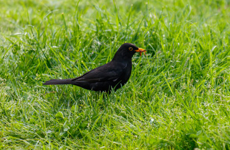 A blackbird brings home a worm for its young.