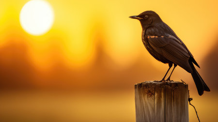 An angry looking black bird during sunset on a wooden fence