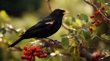 A serene scene featuring a black bird sitting on a berry-laden branch, illuminated by soft sunlight and surrounded by a dreamy bokeh background.