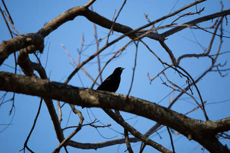 Male red-winged blackbird (Agelaius phoeniceus) looking out from a perch on a tree branch
